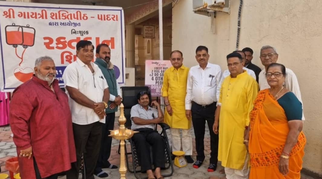 રક્ત દાન મહાદાન છે જે બીમારીમાં જરૂરિયાત લોકોને નવું જીવન પ્રાપ્ત થાય છે પાદરા ગાયત્રી જેમાં દાતાઓ, અગ્રગણ્યો, પરિજનોને ઉપસ્થિતિમાં દિપ પ્રાગટ્ય કરી શિબિર નો પ્રારંભ કરવામાં આવ્યો હતો જે બપોરે એક કલાક સુધી ચાલ્યો હતો જેમાં ભાઇઓ, બહેનો , યુવાનો મોટી સંખ્યામાં રક્ત દાતા તરીકે ભાગ લીધો હતો શક્તિ પીઠ ખાતે ચાલી રહેલ પ્રજ્ઞા પુરાણ કથા ના ત્રીજા દિવસે સવારના ભાગમાં 9થી એક કલાક દરમ્યાન ઇન્દુ બ્લડ બેંક ના સહયોગ થી રક્તદાન શિબિર નું આયોજન કરવામાં આવ્યું હતું
