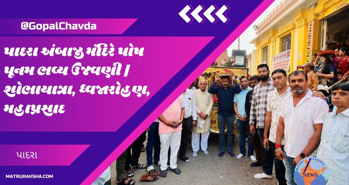 ગોપાલ ચાવડા પાદરા પાદરામાં પ્રસિદ્ધ અંબાજી મંદિરે પોશી પૂનમ માંઆદ્યશક્તિ જગદંબાના પ્રાગટ્યના શુભ દિન ભવ્ય કાર્યક્રમ યોજાયા હતાજેમાં સવારમાં પ્રભાતફેરી નીકળી હતી બપોરે ચંડીપાઠ થયા હતા જ્યારે. બપોરે ધ્વજાની શોભા યાત્રા નગરના મુખ્ય માર્ગો ઉપર નીકળી હતી જેમાં માતાજીના સ્વરૂપને રથમાં પધરાવીને જય માડી અંબે જય જય અંબેના જય નાદ નગરમાં ગુંજ્યા હતા અને શોભાયાત્રા […]